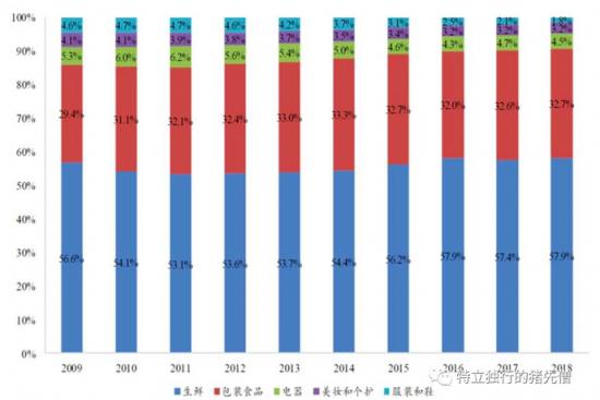 從這一份超市中各商品的占比可知,從2016年到2018年,生鮮的占比相較于2015年還有所提升。2015年,超市中生鮮商品占總商品的56.2%,到了2018年,反倒增長到了57.9%。