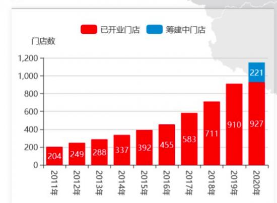 永輝超市近幾年一直處于快速擴張階段。其開店規模從2011年的204家,飛速增長到2019年的910家。截止到2020年年中,已開店數量為938家,另有254家已簽約未開業。