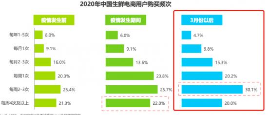 而且就算在疫情期間,生鮮市場的在線購買短暫地增加了,那也是因為不讓出門,人們買菜不方便。到了3月份,數據就回落到跟疫情前差不多。僅僅只有原本每周2-3次的用戶部分有增加。而隨著夏天的到來,生鮮食品不耐保存,這部分數據勢必還將會下降。