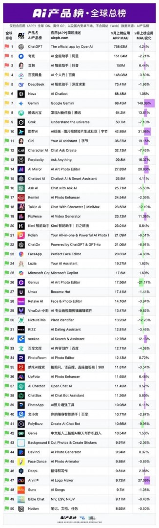 這種形勢與全球市場截然相反。全球總榜上,34個非中國產(chǎn)品里只有5個屬于“大廠”,占比約15%,除Gemini(Google)、Grok(X)、Character.AI(Google)和Microsoft Copilot外,其他幾乎全是來自小團隊或創(chuàng)業(yè)公司。如排名第一的ChatGPT,來自巨星級初創(chuàng)企業(yè)OpenAI。