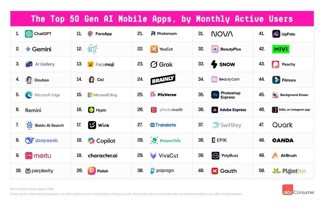 與之對比,全球AI應用市場上,眾多細分賽道則相對活躍。從A16Z最新發(fā)布的一份《全球百強AI消費者應用榜單》第五版可見,除了幾個“老面孔”覆蓋了幾乎所有高頻場景—學習、陪伴、設計、生產(chǎn)力、社區(qū),作為“黑馬”的幾款產(chǎn)品來自不同的領域。比如主打氛圍編程的Lovable 直接沖到第 22 位,Suno首次把音樂生成帶入主榜。
