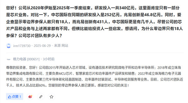 投資者還注意到格力電器的零邊界公司參保人數僅為18人,格力電器芯片團隊規模近千人,投資者在互動平臺上對格力電器的芯片業務提出了質疑。