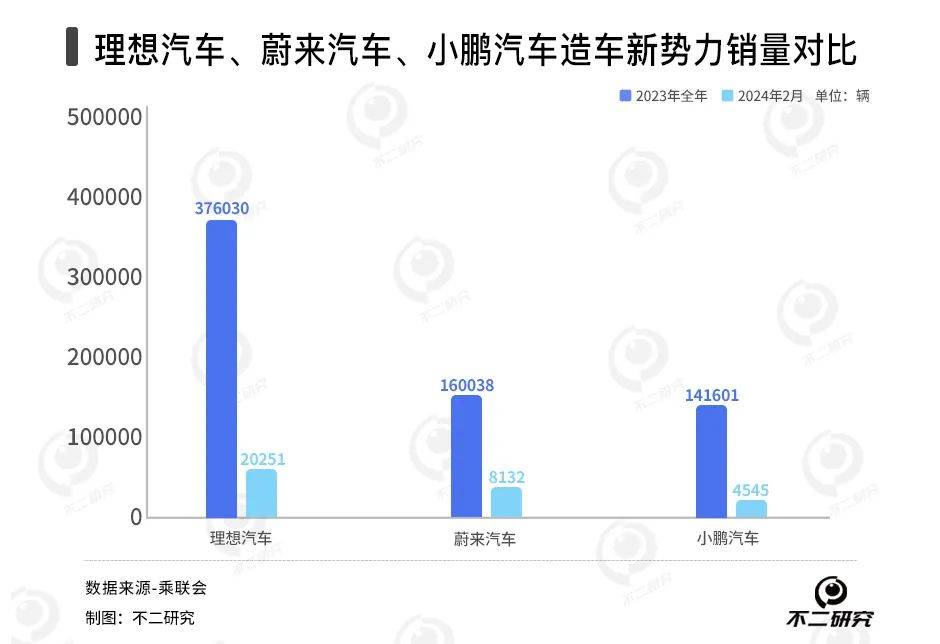 根據(jù)最新公布的銷售數(shù)據(jù):2024年2月,理想汽車的交付量分別達(dá)到20251輛,同期,蔚來的交付量只有8132輛;而小鵬汽車則為4545輛。