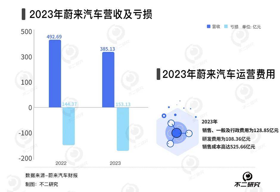 據(jù)財(cái)報(bào)數(shù)據(jù)顯示,蔚來的運(yùn)營(yíng)費(fèi)用也出現(xiàn)明顯增長(zhǎng)。2023年,蔚來的全年銷售成本高達(dá)525.66億元,同比增長(zhǎng)19.1%;同期,銷售、一般及行政費(fèi)用為128.85億元,同比增長(zhǎng)22.3%。