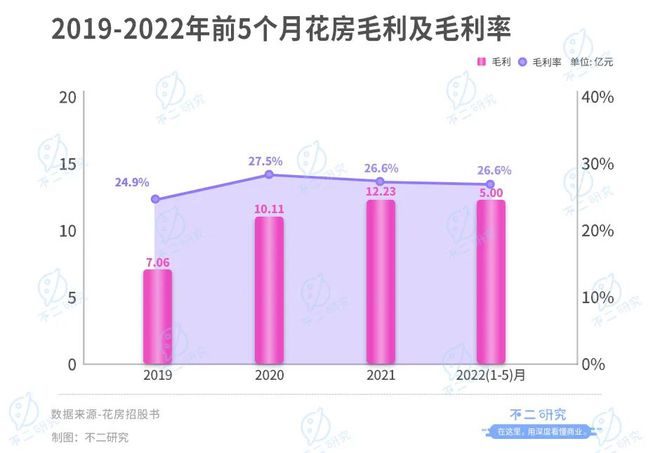 招股書顯示,2019-2021年及2022年前5個月花房的收入分別為28.31億、36.83億、46.00億、20.87億,營收一直處于穩步上漲趨勢。