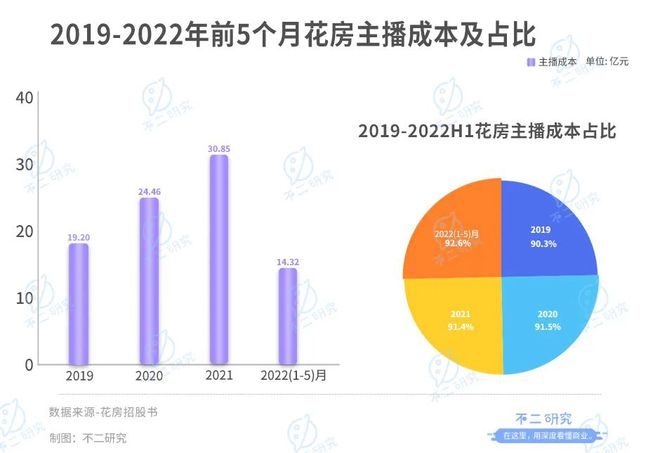 2019-2021年及2022年前5個月其主播成本分別為19.20億、24.46億、30.85億、14.32億;分別占總銷售成本的90.3%、91.5%、91.4%、92.6%。