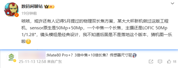 華為Mate80 Pro+或搭載雙長焦:主攝采用1/1.28英寸LOFIC超大底傳感器快訊