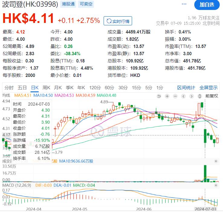 7月3日,波司登公告顯示,高德康將按4.31港元/股的價格配售公司4億股股份。以此換算,高德康將套現(xiàn)超17億港元。隨即波司登股價接連四日下跌,累計跌幅達到19.81%。