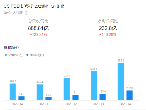 3月20日,拼多多集團發布2023Q4季度及全年業績報告,Q4季度營收為889億元,同比增長123%,2023年全年營收為2476億元,同比增長90%。
