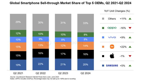 根據Counterpoint Research,二季度全球手機市場迎來了6%的同比增長率。但同樣是增長,也有高下之分。小米以22%的增長領跑前五。