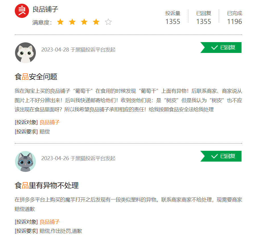但“螳螂觀察”查詢了黑貓投訴平臺,目前平臺有關良品鋪子的1000余條投訴里,依然有不少是“食品上有異物”等食品安全問題。