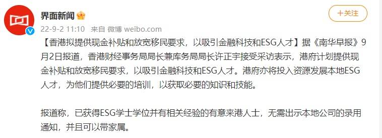 更夸張的是,就連某些地方都親自下臺“搶人”了。香港財經事務局局長在去年喊話表示,港府計劃提供現金補貼和放寬移民要求,以吸引金融科技和ESG人才。