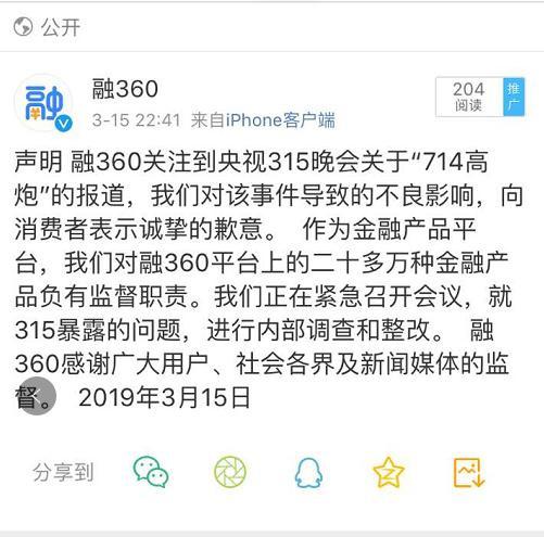 并表示融360作為金融產品平臺,應該對融360平臺上的二十多萬種金融產品負有監督職責。并且正在緊急召開會議就315暴露的問題,進行內部調查和整改。感謝廣大用戶、社會各界及新聞媒體的監督。