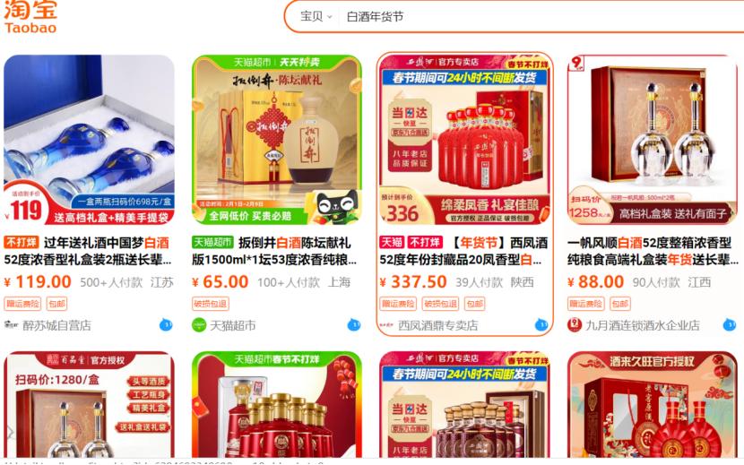 再看線上,據觀察,天貓1月17日—1月29日年貨節期間,茅臺推出了50000瓶1499元飛天茅臺,僅在開售當晚就出現了秒空的狀況;而其他200-500元區間的中端酒或雜牌酒,就算推出"買一送一""大額優惠券"活動,銷量依舊不高,高的也僅百人左右購買。