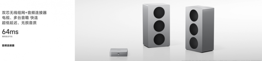為了給用戶創造更加沉浸的聽覺感受,小米還同步推出了 Xiaomi Sound 無線音頻連接器,采用專業的獨立組網芯片,搭載小米私有無線音頻傳輸協議,帶來媲美有線的穩定連接性能,避免了線材部署的麻煩。Xiaomi Sound 無線音頻連接器可通過 HDMI 或 S/PDIF 接口的線材(HDMI 線材需支持 HDMI ARC 或 HDMI eARC)連接電腦、電視、投影儀等播放設備,在小米音箱APP上快速完成設備配網并將兩臺 Xiaomi Sound 2 Max 組成 2.0 立體聲,或將四臺 Xiaomi Sound 2 Max 組合成 4.0 環繞聲。Xiaomi Sound 無線音頻連接器支持多臺音箱組合下的 CD 級無損音頻傳輸,同時能提供全鏈路超低時延,經實測默認模式下,時延可穩定在60ms級別。此外,Xiaomi Sound 無線音頻連接器還能將常規的 2.0 立體聲自動轉換為 4.0 環繞聲,并能適配市面上主流的電視品牌,讓用戶居家就能體驗到影院級的沉浸聲場。