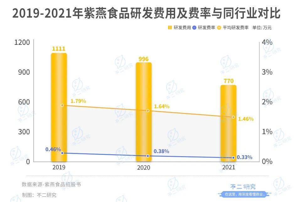據(jù)紫燕食品招股書顯示,紫燕食品2019-2021年的研發(fā)費用分別為1111萬、996萬及770萬,對應(yīng)研發(fā)費用率為0.46%、0.38%、0.33%,而同期的行業(yè)平均研發(fā)費用率為1.79%、1.64%、1.46%,紫燕食品的研發(fā)費用率遠不及鹵味行業(yè)平均。