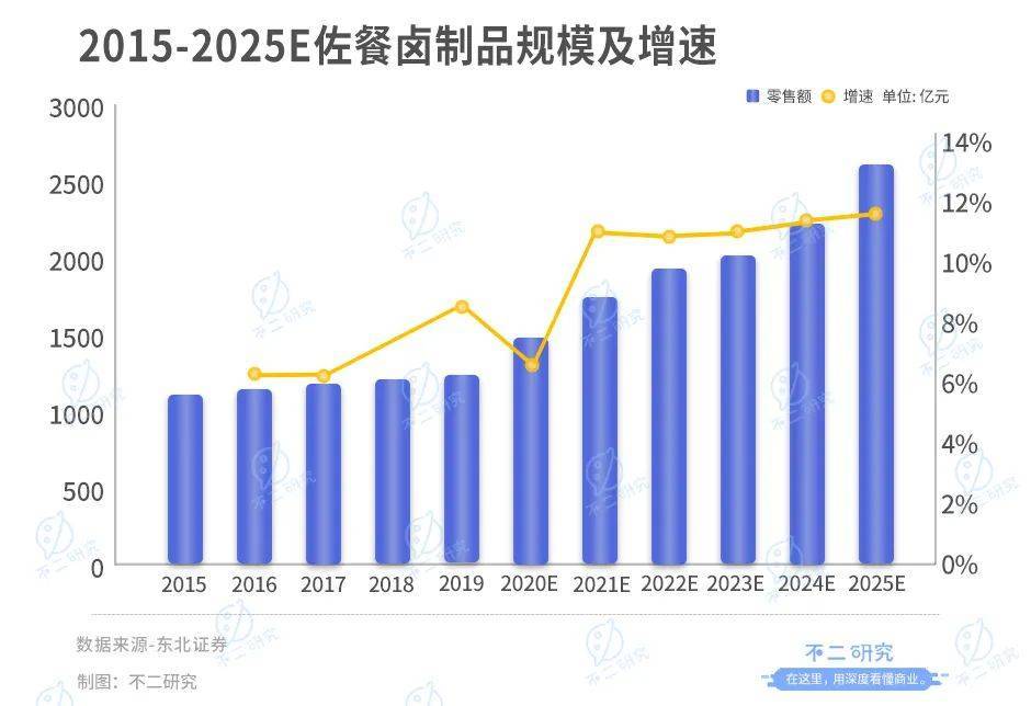 休閑鹵味和佐餐鹵味各占鹵味賽道半壁江山,據(jù)CBNDATA數(shù)據(jù)顯示,2021年佐餐和休閑鹵制品的行業(yè)規(guī)模分別為1792億元和1504億元。佐餐鹵味更是保持較高增速,據(jù)弗若斯特沙利文數(shù)據(jù)顯示,2020-2025年佐餐鹵制品的CAGR將提速至11.4%,到2025年行業(yè)規(guī)模將達2799億元。