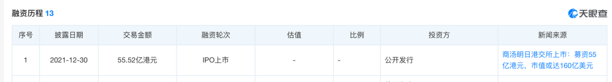 天眼查APP顯示,商湯科技2021年在香港上市,彼時上市募資55億港元。