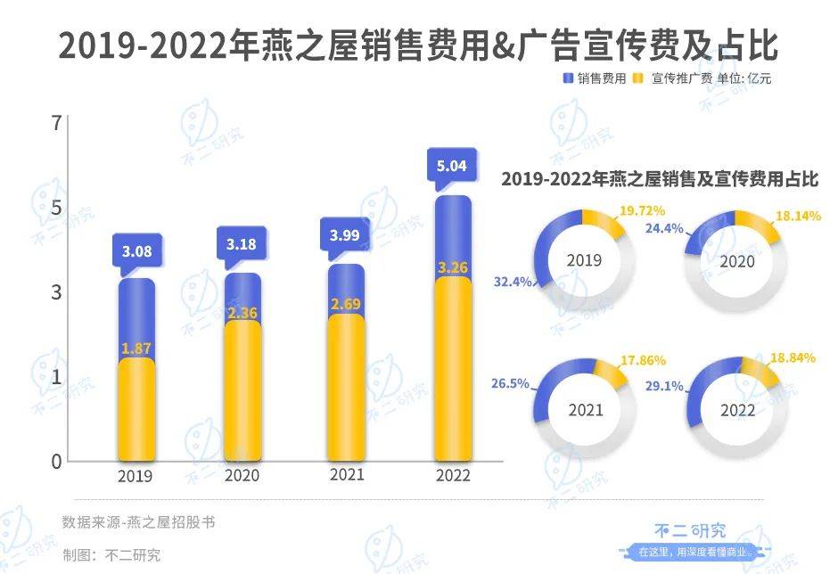 在「不二研究」看來,雖然燕之屋的營收平穩上升,或是依托于高額廣告宣傳費用,以營銷增長換收入增長。
