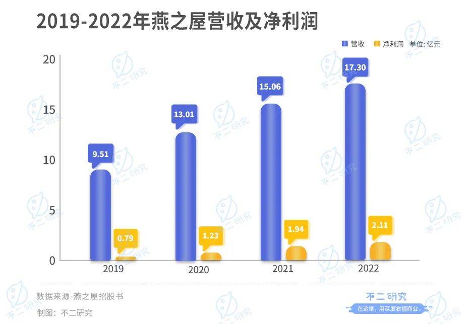 「不二研究」據燕之屋新版招股書中發現:2022年,其營收為17.30億元,同比增加14.87%;同期的凈利潤為2.11億元,同比增加8.76%。