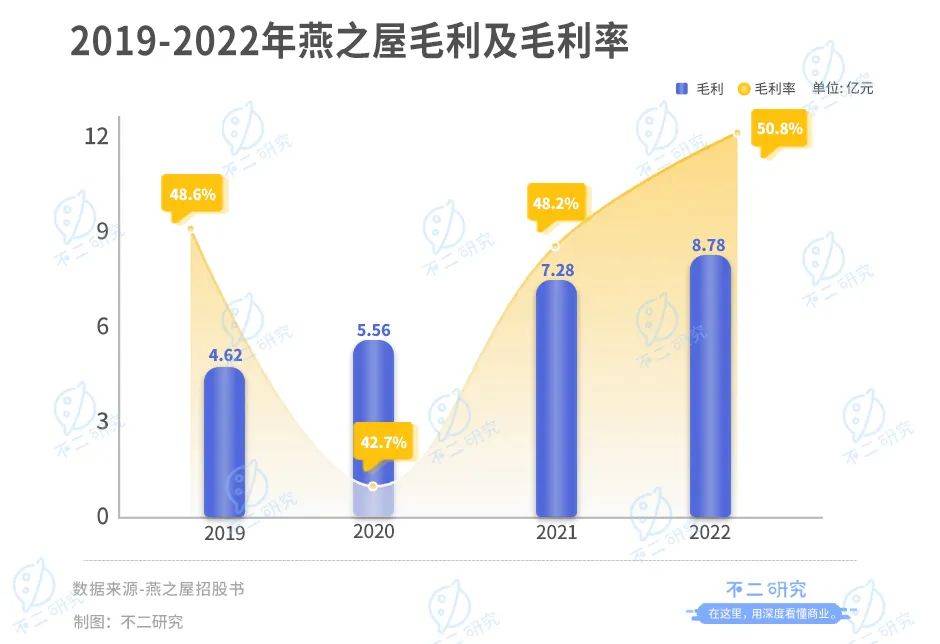同期,燕之屋的毛利總額分別為4.62億元、5.56億元、7.28億元和8.78億元,毛利率為48.6%、42.7%、48.2%和50.8%。