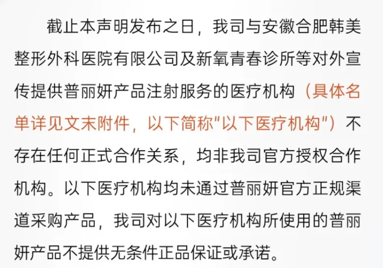近日,童顏針廠商普麗妍的一紙公告,將醫美行業暗流涌動的供應鏈矛盾徹底公開化。公告直指79家“非官方合作醫療機構”,其中新氧旗下46家青春診所赫然在列,被標注為“黑名單醫美機構”。普麗妍警告消費者,這些機構使用的產品可能“來源不明、真假難辨”,存在多重風險。