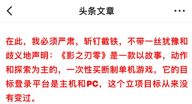 也不知他寫下《 < 影之刃零 > 是買斷制單機游戲 》的時候,心里想的是不是 “ 十年磨一劍,歸來仍少年 ” 。