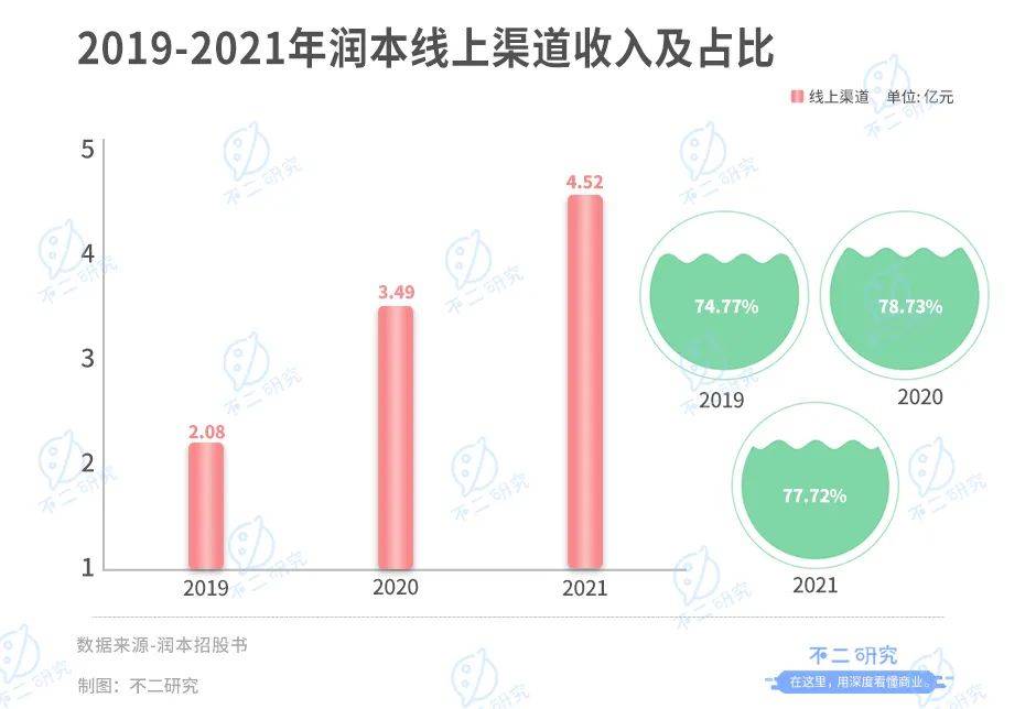招股書顯示,2019年-2021年,來自線上渠道的收入分別為2.08億、3.49億和4.52億元,對銷售收入的貢獻分別為74.77%、78.73%和77.72%,占比接近八成。
