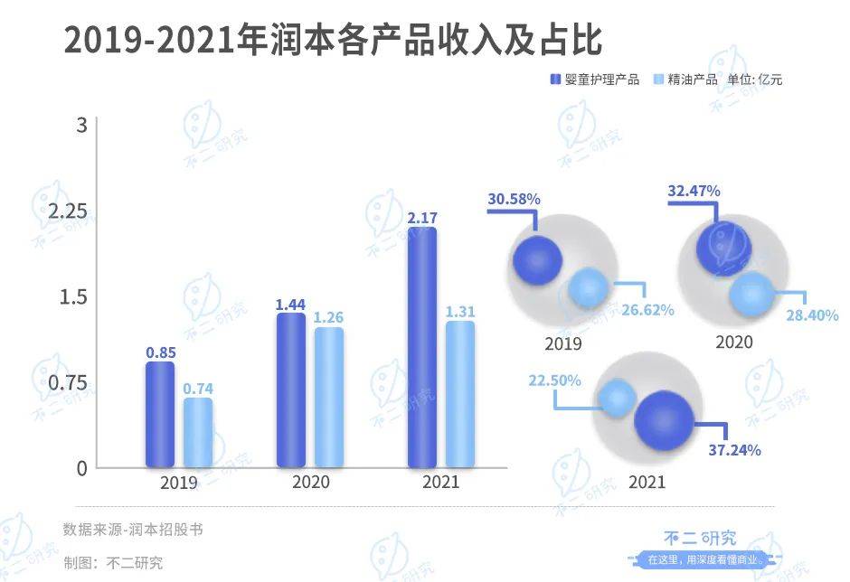 招股書數(shù)據(jù)顯示,2019年-2021年,潤本嬰童護理產(chǎn)品收入分別為0.85億、1.44億和2.17億元,占比分別為30.58%、32.47%和37.24%;精油產(chǎn)品收入分別為0.74億、1.26億和1.31億元,占比則分別為26.62%、28.40%和22.50%。從數(shù)值上看均處于穩(wěn)步增長中。