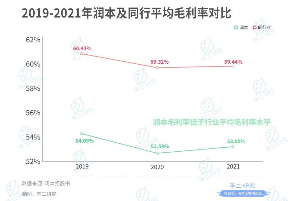 更令人憂心的是,潤本的毛利率水平較低,顯示出盈利能力上的劣勢。招股書顯示,2019年-2021年,潤本的綜合毛利率分別為54.09%、52.53%和53.05%;低于行業(yè)平均毛利率水平的60.43%、59.32%和59.44%。