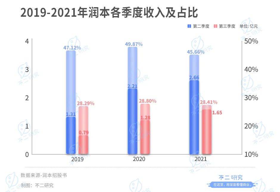 據(jù)招股書顯示,2019年-2021年,潤本第二季度的收入分別為1.31億、2.21億和2.66億元,占比分別為47.12%、49.87%和45.66%;第三季度的收入分別為0.79億、1.28億和1.65億元,收入占比分別為28.29%、28.80%和28.41%。