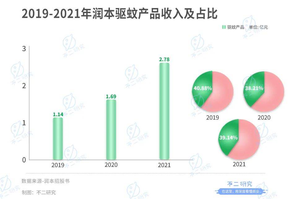 招股書數(shù)據(jù)顯示,2019年-2021年,驅蚊產(chǎn)品貢獻營收分別為1.14億、1.69億和2.78億元,占潤本總營收的40.88%、38.21%和39.14%,主要包括電熱蚊香液和驅蚊噴霧品類。