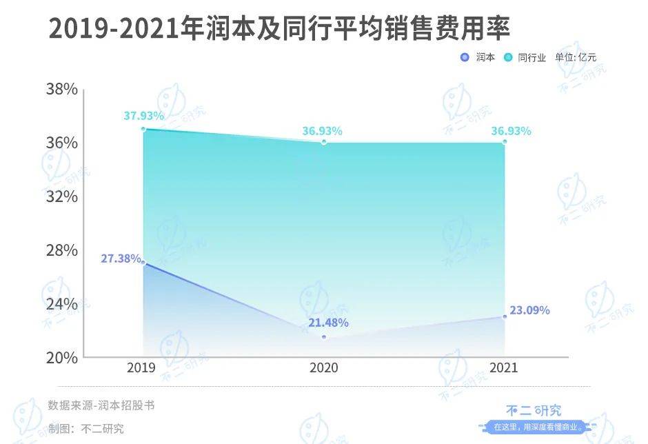 不過值得注意的是,雖然潤本銷售費用不斷增加,但其銷售費用率與同行相比更有優(yōu)勢。2019年-2021年,潤本的銷售費用率分別為27.38%、21.48%和23.09%;同行可比上市公司銷售費用率平均值為37.93%、36.93%和36.93%,遠高于潤本。
