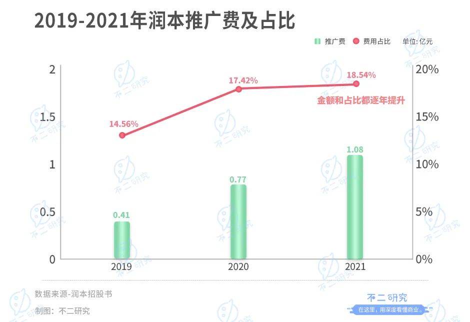 招股書顯示,潤本向電商平臺支付的流量推廣、平臺傭金以及技術服務等費用逐年攀升。招股書顯示,2019年-2021年,潤本的推廣費分別為0.41億、0.77億和1.08億元,占營業(yè)收入的比例分別為14.56%、17.42%和18.54%,金額和占比都逐年提升。