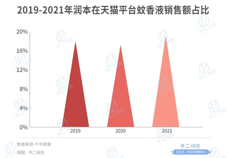 雖起步較遲,但在線上渠道方面,潤本“后來居上”。自2010年開始,潤本就開始轉型線上,先后進駐天貓、京東、抖音等電商平臺。根據(jù)千牛數(shù)據(jù),2019年至2021年“潤本”品牌在天貓平臺的蚊香液銷售額占比分別為 17.14%、16.42%和18.32%,連續(xù)三年排名第一。