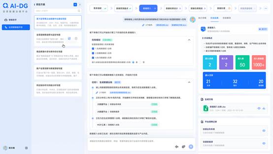 平臺采用“對話式治理”新模式,用戶通過自然語言描述業務需求,系統即可精準理解意圖并自動調度多智能體協同工作,完成數據探查、標準制定、模型設計與集成開發的全鏈路任務。該創新交互將傳統數月的設計開發周期壓縮至天級,顯著提升業務團隊參與深度和治理效率。