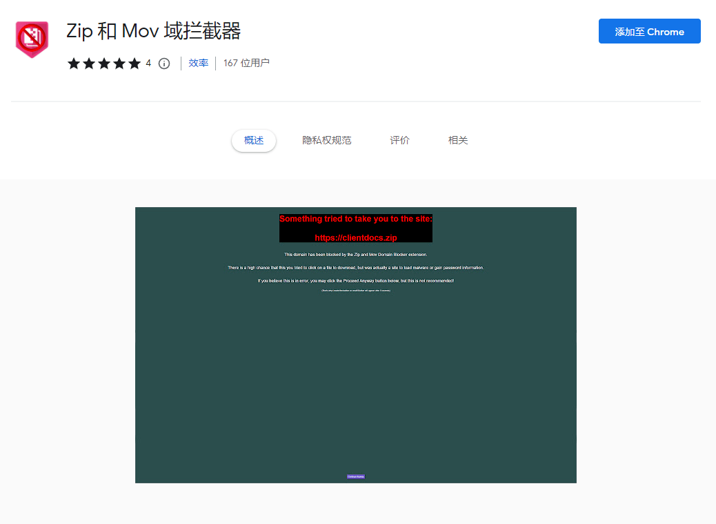 甚至還有人為了一勞永逸,做了一個(gè) Chrome 插件,用來(lái)禁止瀏覽器訪問(wèn). zip 和. mov 域名。