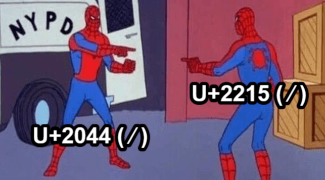 其實(shí)仔細(xì)看能發(fā)現(xiàn),這個(gè)正斜杠長(zhǎng)的不太一樣。因?yàn)樵谠蹅兂S玫淖址斜砝铮辛硗鈨蓚€(gè)和 / 非常像的字符: