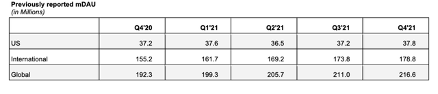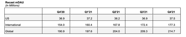 從2018年Q4開(kāi)始,Twitter對(duì)于用戶規(guī)模的披露就采用了mDAU這一指標(biāo),希望更精準(zhǔn)的數(shù)據(jù)去反應(yīng)用戶價(jià)值,但本季度對(duì)該指標(biāo)再次做出調(diào)整,修正了前5個(gè)季度的數(shù)據(jù)。