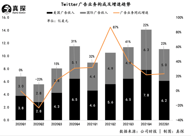 2022Q1,Twitter廣告業(yè)務(wù)收入為11.1億美元,同比增長(zhǎng)23%,環(huán)比下降21%(Q1通常是廣告支出淡季)。其中美國(guó)市場(chǎng)廣告收入為6.2億美元,國(guó)際廣告收入為5.0億美元。