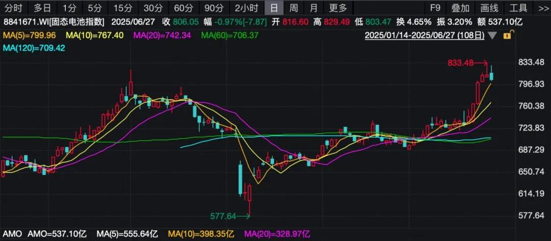 復盤來看,去年以來,A股市場固態電池板塊已走出4波大行情,最新一輪起始于“關稅劫”后的4月9日,到6月26日盤中高點,固態電池指數最大漲幅已超過44%,大幅跑贏大盤同期12.79%的漲幅;加速拉升則在6月20日之后,多只概念股氣勢如虹,走出連板行情。