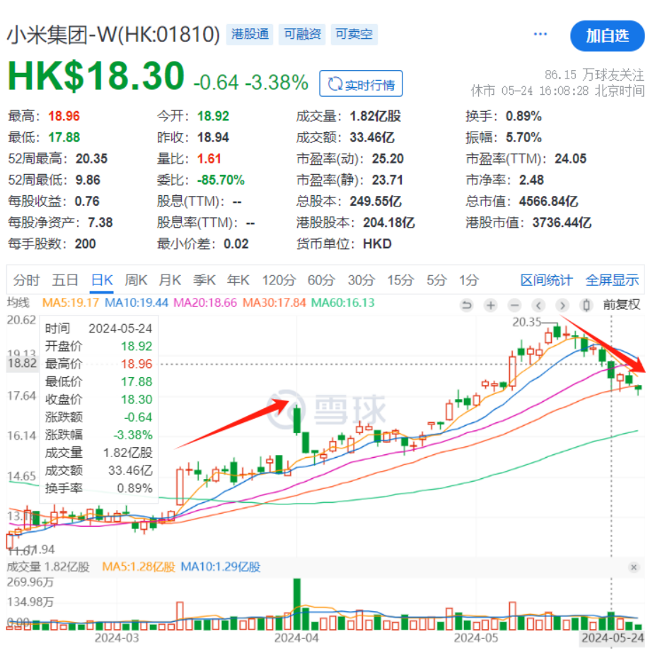 財報后,小米股價累跌7.32%,29日的收盤價為18.3港元/股,市值4566.84億港元。