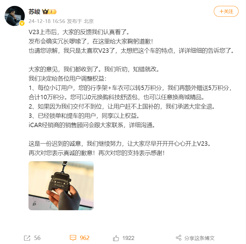 面對市場的強烈反響,蘇峻雖迅速在社交平臺上道歉,并給出了積分補償的補救措施,但這一切似乎都未能挽回消費者的心。從目前的市場表現來看,iCAR V23的“慢熱長紅”之說,更像是一個遙不可及的夢想。