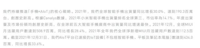 這點在小米的財報中也有體現,小米的財報在描述IoT業務發展成果時,會陳列設備連接數、MIUI和小愛同學的月活。