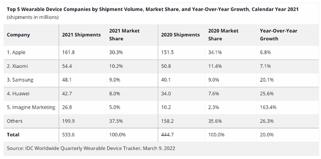 更直白一點的是各自的市場份額對比。以可穿戴市場為例,它和智能家居并列為IoT的兩大細分市場。IDC數據顯示,2021年,中國可穿戴市場出貨量接近1.4億臺,全球的出貨量為5.336 億臺。