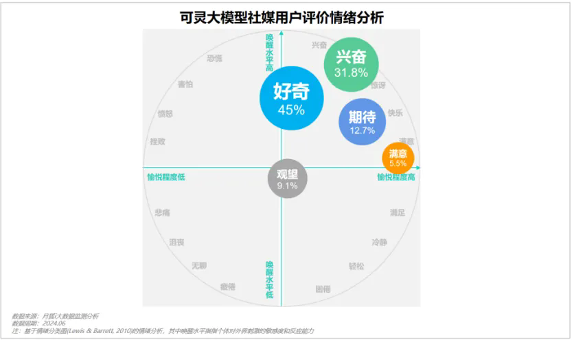 可靈AI用戶快速增長背后,一方面是因為用戶對文生視頻的“好奇”。月狐數據對與可靈AI相關的社交媒體用戶評論數據進行了分析,用戶情緒主要表現為好奇、興奮、期待和滿意。