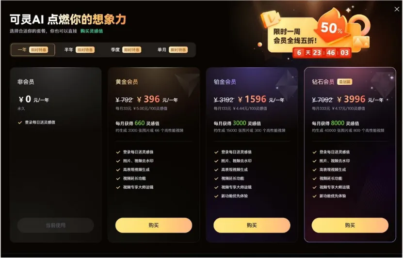 用戶規模是產品商業化的土壤,基于此,外界對于可靈商業化的想象空間也被進一步打開。目前,可靈AI已經上線了付費會員體系,分為黃金、鉑金、鉆石三個級別,月卡價格分別為66元、266元和666元,對應生成約66個、300個或800個標準視頻。