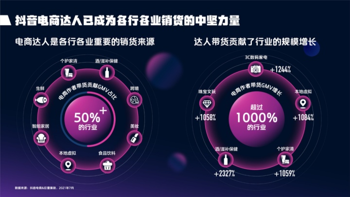 數(shù)據(jù)來源:《2021抖音電商達人生態(tài)報告》 F、A、C、T分別代表商家自播、達人矩陣、營銷活動、頭部大V,這四個維度相輔相成,為商家在抖音電商平臺的持續(xù)經(jīng)營提供了支持。 擁有多元優(yōu)質(zhì)內(nèi)容生產(chǎn)力的電商達人們,不但是抖音電商作為興趣電商平臺的核心競爭力,更是連接商家與用戶的核心橋梁——達人的創(chuàng)作、互動和分發(fā),連接起平臺與用戶;達人創(chuàng)作的興趣內(nèi)容,連接粉絲與美好生活,達人的直播連接起商家與用戶。 短視頻+直播的內(nèi)容形式在直觀展現(xiàn)商品特色及使用場景、激發(fā)用戶購物需求的同時,達人們優(yōu)質(zhì)內(nèi)容互動與用戶建立更高效直接的連接,極速縮短用戶決策路徑和購物鏈路,也促成品牌的爆發(fā)。 對于抖音電商來說,聚焦內(nèi)容創(chuàng)作的達人已經(jīng)成為興趣電商模式不可或缺的力量。 在過去的一年里,他們快速成長,帶貨視頻發(fā)布量增長近2倍。進入2021年后,帶貨直播熱情繼續(xù)上揚,數(shù)據(jù)顯示,截至8月,帶貨直播場次比1月增加了84%,月均發(fā)布視頻數(shù)1億條。 抖音電商達人已經(jīng)成為各行業(yè)銷貨的中堅力量。2021年7月,在美妝、食品飲料、個護家清、智能家居等行業(yè),抖音電商達人帶貨貢獻GMV占比超過50%,而在3C數(shù)碼家電、珠寶文玩、酒/滋補保健等行業(yè),電商達人帶貨GMV實現(xiàn)了超過1000%的增長。