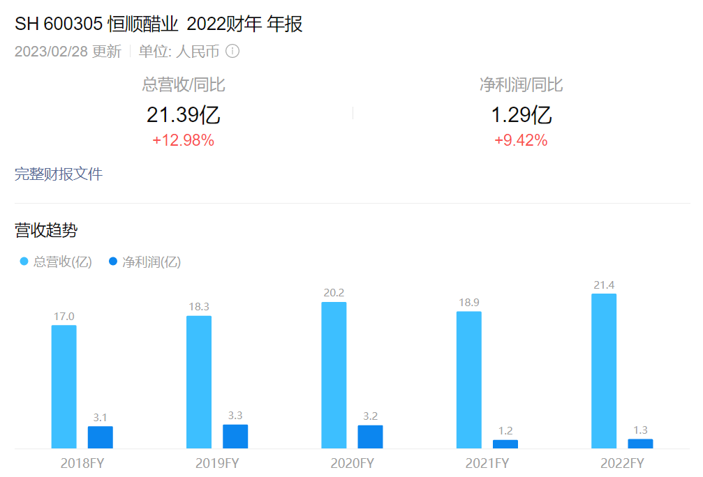 根據(jù)財(cái)報(bào)顯示,2022年,恒順醋業(yè)實(shí)現(xiàn)營(yíng)業(yè)收入21.39億元,同比增長(zhǎng)12.98%;實(shí)現(xiàn)歸母凈利潤(rùn)1.38億元,同比增長(zhǎng)16.04%。
