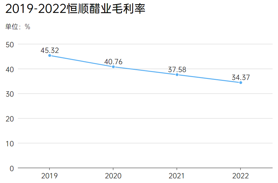 財(cái)報(bào)顯示,從2019到2022年的四年間,恒順醋業(yè)的毛利率分別45.32%、40.76%、37.58%,34.37%,一路下滑。